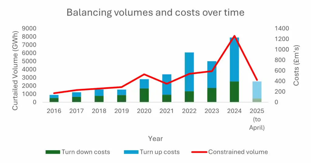 Wind curtailment in Scotland due to transmission capacity issues has led to high balancing costs and curtailment of new wind farms. Upgrades to the transmission network are underway but delayed, and operational reductions in capacity have also contributed to the problem.
