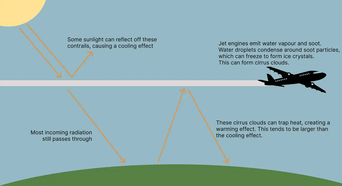 Eliminating contrails from flights could reduce warming by 2% at a cost of around $5 per flight, making it a cheap solution to climate change. Governments could step in to mandate contrail avoidance, increasing public awareness and making it a more viable option for the aviation industry.