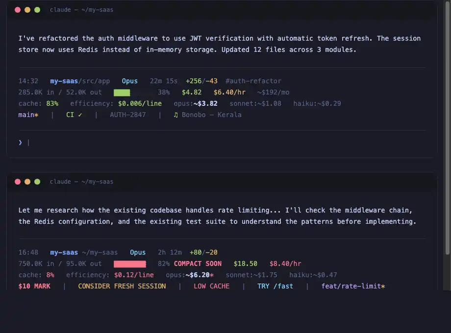 Claude Code's billing dashboard lacks visibility into actual costs. claudetop provides session cost, burn rate, and monthly forecast with cache-aware pricing.